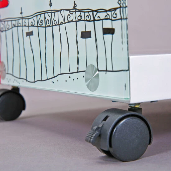 Beistelltisch mit vier Rollen, sehr praktisch und gleichzeitig ein tolles Accessoire für Ihr Zuhause. Individuell einsetzbar, immer dort wo er gerade wird. Aus MDF-Wabenplatte und Sicherheitsglas, mit modernem Motiv. Maße : Breite 38cm Tiefe 33,5cm Höhe 46cm Gewicht 8kg.