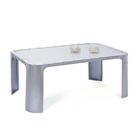 Großer genieteter Couchtisch im Industrie-Design. Aus Metall / silber. Dieser robuste Couchtisch ist ein wahrer Eye-Catcher in jedem Wohnzimmer. Der Couchtisch ist besonders stabil und wurde in aufwendiger Handarbeit gefertigt. Dies macht jeden einzelnen Tisch der Serie zu einem echten Unikat.