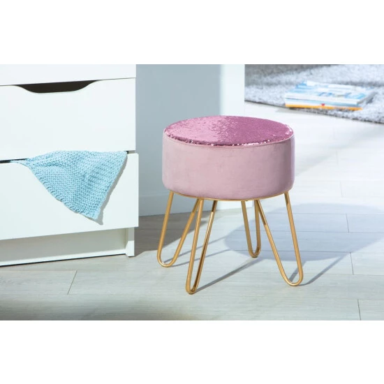 Wunderschöner Sitzhocker mit extravaganten Wendepailletten. Mit wertigem Samt / Polyester Bezug und goldfarbenem Gestell. Ein echter Eye-Catcher und vielseitig einsetzbar. Ob im Eingangsbereich, Wohn- oder Schlafzimmer: Der Design Hocker kann dekorativ hervorragend platziert werden und die vorhandene Einrichtung optisch aufwerten und ergänzen.