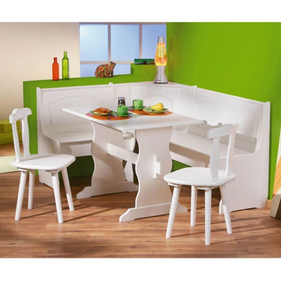 Praktisch! Mit der Eckbankgruppe Donau nutzen Sie effizient Ecken im Esszimmer. Die Gruppe besteht aus einer Sitzbank, welche links und rechts gestellt werden kann, dem Esstisch und zwei Esszimmerstühlen. Die Sitzfläche der raffinierten Sitzbank kann hochgeklappt werden. Darunter befindet sich Stauraum. Der zeitlose Landhausstil vermittelt ein heimisches Gefühl von Geborgenheit. Nehmen Sie Platz und genießen Sie den Moment mit Ihren Liebsten. Der zeitlose Landhausstil vermittelt ein heimisches Gefühl von Geborgenheit. Nehmen Sie auf der Sitzbank Platz und genießen Sie den Moment mit Ihren Liebsten. Die Oberfläche wurde leicht weiß lackiert. Dadurch bleiben natürliche Holzmaserungen bewusst sichtbar. Dieses Verfahren hebt den einzigartigen Naturholzcharakter hervor. Das verwendete Weihrauchkiefer Massivholz stammt aus einer umweltfreundlichen Produktion und wurde nach neusten, europäischen Standards verarbeitet. Aufgebautes Maß Eckbank: 124 – 163 x 49 x 85 cm / Aufgebautes Maß Tisch: 109 x 70 x 75 cm / Aufgebautes Maß Stuhl: 46 x 47 x 82 cm