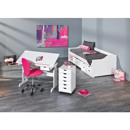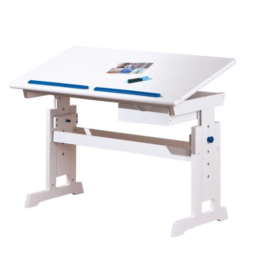 Baru ist ein ergonomischer Kinderschreibtisch. Dadurch, dass der Kindertisch Baru an die Größe des Kindes angepasst werden kann, ermöglicht der Kindertisch ein entspanntes Lernen in der richtigen Körperhaltung. Durch die neigbare Tischplatte von Baru kann der Tisch je nach Tätigkeit angepasst werden. So werden Haltungsschäden, die durch langes, falschen Sitzen entstehen können vorgebeugt. In der Schublade können alle Dinge, die zum Lernen benötigt werden, untergebracht werden. Das Gestell ist weiß lackiert. Um den natürlichen Massivholz-Charakter hervorzuheben, wurde das Gestell so lackiert, dass die einzigartigen Maserungen sichtbar bleiben. Die Tischplatte ist weiß melaminbeschichtet und robust gegenüber Schmutz. Durch die glatte Oberfläche ist diese leicht zu reinigen. Die Tischplatte verfügt über zwei Halter, die das Ablegen von Heften und Büchern in geneigter Position möglich machen. Die Applikationen in den Farben blau und rosa sind beide im Lieferumfang enthalten. So können Sie frei entscheiden, welche der beiden Kombinationen Ihnen besser gefällt. Aufgebaute Maße: 109 x 55 x 63-96 cm