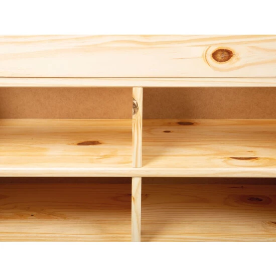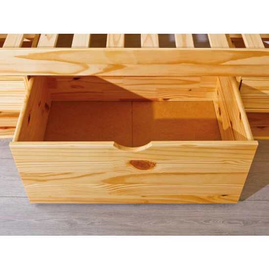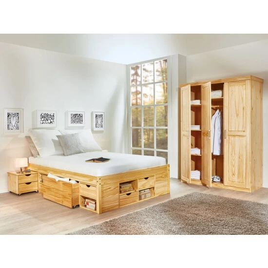 Das Funktionsbett eignet sich optimal für kleinere Räume wie z.B. Das Gästezimmer. Das Funktionsbett Claas ist besonders praktisch. Die Schubladen sind in einer Einheitsgröße und können nach Ihren wünschen angeordnet werden. Damit sich kein Staub unter dem Bett sammelt, ist das Funktionsbett voll verblendet. Das Bett ist mit 4 Schubladen, 2 Schubkästen, 12 Fachböden und 2 Nachtkommoden ausgestattet. Bettwäsche und andere Utensilien können einfach unter dem Bett verstaut werden. Die transparent lackierte Oberfläche (Natur) unterstreicht den warmen Naturholzcharakter. Die schadstoffarme Lackierung ist wasserabweisend und pflegeleicht. Das für die Fertigung von Claas verwendete Kiefer Massivholz erfüllt alle europäischen Qualitätsstandards nach neusten Richtlinien. Das solide Funktionsbett überzeugt mit einer hohen Beständigkeit und entsprechend professioneller Verarbeitung. Lattenrost enthalten: Ja. Aufgebaute Maße (BxTxH): 146 x 209 x 47,5 cm.