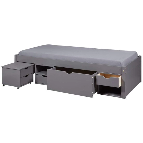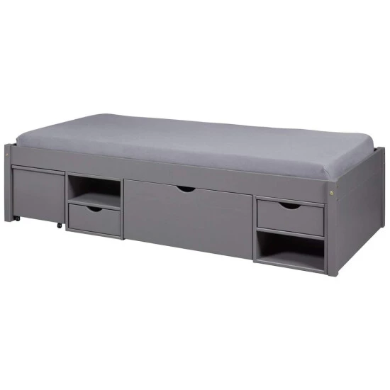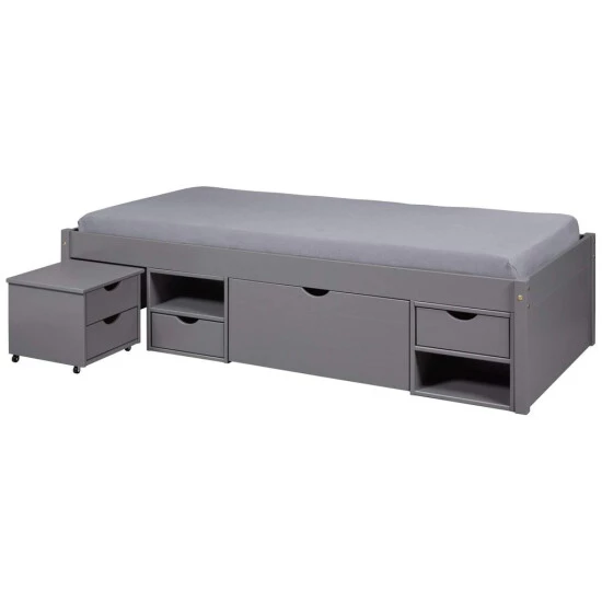 Das Massivholzbett Till Grau stellt sich Ihnen als absolutes Stauraumwunder vor. Auf einer Stellfläche von 209 x 96 cm befindet sich nicht nur ein Bett aus massiver, robuster Kiefer. Es nutzt den Raum unter dem Lattenrost auch hervorragend als Stauraum. Zwei kleine Schubladen, eine große Schublade auf Rollen und offene Fächer haben Platz für die unterschiedlichsten Dinge. Zusätzlich bringt das Massivholzbett Till Grau sogar noch einen Nachtschrank mit, der bei Nichtnutzung einfach wieder unter das Bett gerollt wird.