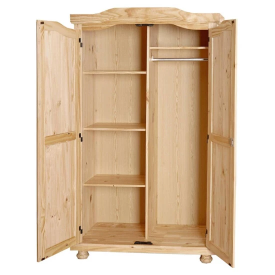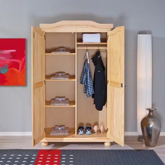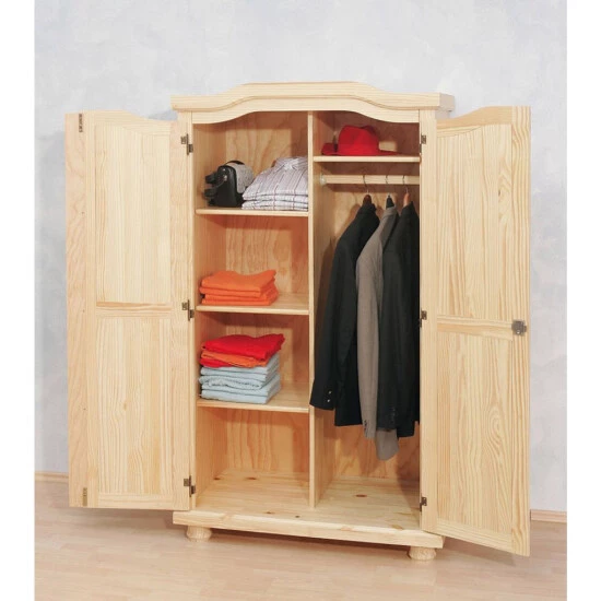 Aus natur lackiertem Massivholz, mit stilvollen Beschlägen und stabilen stilecht gedrechselten Füßen ist dieser Schrank im beliebten Landhausstil schön und überaus nützlich zugleich. Dank intelligenter Aufteilung mit vier reinen Wäschefächer auf der einen Seite und einem weiteren nebst einer stabilen Kleiderstange bietet er bei geringem Raumanspruch viel Platz für Jacken, Hosen, Hemden und vielen mehr.