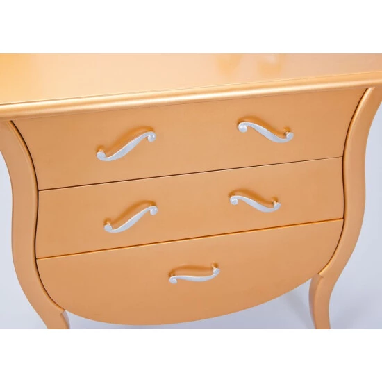 Einzigartige Kommode im modernen Barock-Stil. Der Korpus besteht aus MDF, die Beine aus Birkenholz. Mit hochwertigem Oberflächenfinish. 3 Schubfächer mit perfekt dazu passenden Griffen. Der Mix aus antiker Form und auffällig goldener Farbe machen diese Kommode zu einem exquisiten Möbelstück. Die Besonderheit: Die Fertigung erfolgt in echter, aufwändiger Handarbeit. Keine Kommode der Serie gleicht zu 100 % der anderen – Sie erhalten ein Einzelstück!