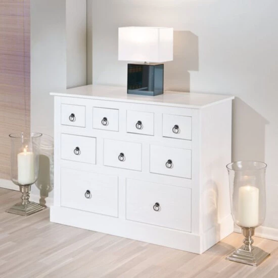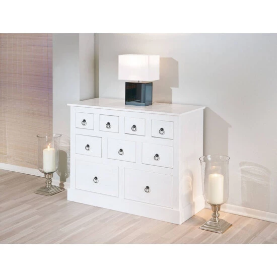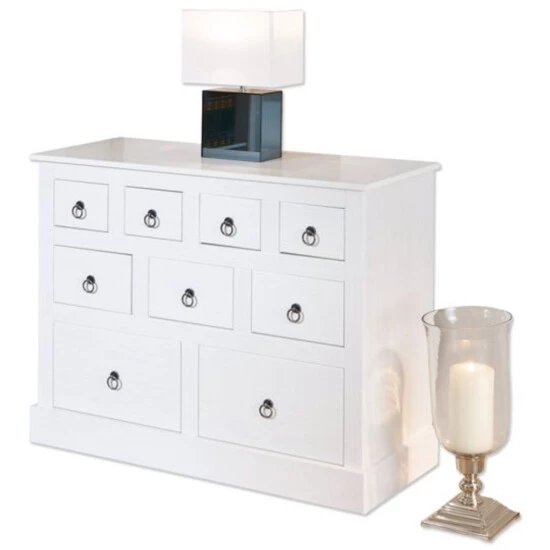 Provence 2 ist eine robuste Verarbeitete Kommode. In den 9 Schubladen befindet sich reichlich Stauraum um Ihre liebsten Dinge organisiert unterzubringen. Das Massivholz ist weiß lackiert. Durch die Lackierung kommen die Maserungen der Weihrauchkiefer wunderschön zur Geltung. Der verwendete Lack schützt das Holz und ist besonders pflegeleicht. Der Schubladenschrank wird ausschließlich mit ausgewählten Materialien angefertigt. Dadurch ist das in der Produktion verwendete Kiefernholz (Massivholz Weihrauchkiefer) besonders Stabil. Das Massivholz wurde umweltfreundlich verarbeitet. Es vermittelt ein heimisches Gefühl von Wärme und Geborgenheit. Aufgebautes Maß: 100 x 39 x 80 cm.
