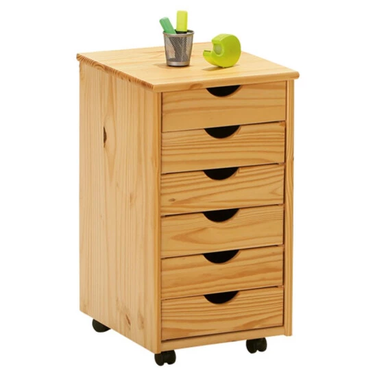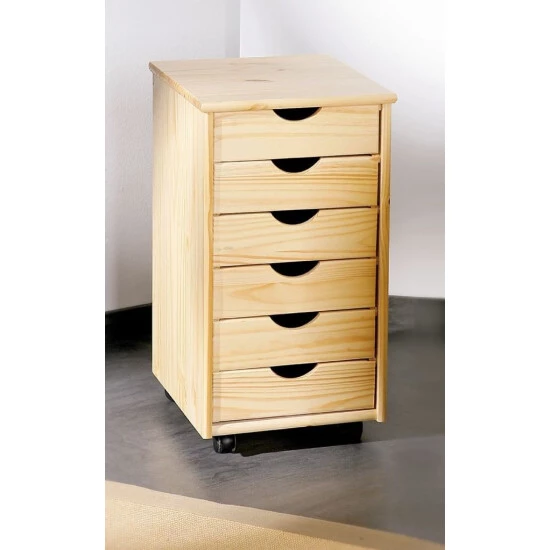 Ob im Homeoffice oder Kinderzimmer: Mit einem Rollcontainer sind die wichtigsten Utensilien immer in optimaler Griffreichweite! Dank 4 Rollen ist dieser Container flexibel und kann beliebig platziert werden. Er bietet viel Platz in welchem z.B. Büromaterialen oder Dokumente untergebracht werden können. Gleichzeitig bieten die Schubladen die Möglichkeit einer ordentlich sortierten Organisation. Anzahl Schubladen: 6. Die Oberfläche ist mit einem transparenten Lack behandelt worden. Dabei kommen die individuellen Holzmaserungen des Massivholzes wunderschön zur Geltung. Das für die Herstellung verwendete Massivholz stammt aus der robusten Weihrauchkiefer und wird nach strengen europäischen Vorgaben verarbeitet. Aufgebaute Maße: 35 x 40 x 65 cm