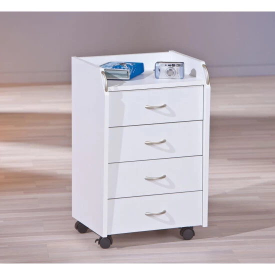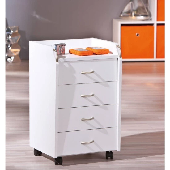 Container sind praktische Helfer an jedem Schreibtisch. Ob im Homeoffice oder Kinderzimmer: Mit dem Rollcontainer Pronti sind die wichtigsten Utensilien immer in optimaler Griffreichweite! Immer flexibel unterwegs! Der Container Pronti ist mit Rollen ausgestattet und ist dadurch immer dort wo man ihn braucht. Dank seiner Schubladen bietet der Container nützlichen Stauraum. Anzahl Schubladen: 4. Die Ablagefläche des Rollcontainers ist mit praktischen Griffen ausgestattet, die das schieben erleichtern. Durch die genialen Stopperleisten bleiben Gegenstände die auf der Ablagefläche liegen auf ihrem Platz, wenn der Container verschoben wird. Die Oberfläche ist weiß. Durch die neutrale Farbe passt der Container ergänzend zu einer Vielzahl von Einrichtungsstilen. Der Container besteht aus Spanplatte. Die Oberfläche ist Kratz- und Fettfest, was Sie zur idealen Oberfläche im Homeoffice macht. Aufgebaute Maße BxTxH: 40 x 36 x 65 cm.