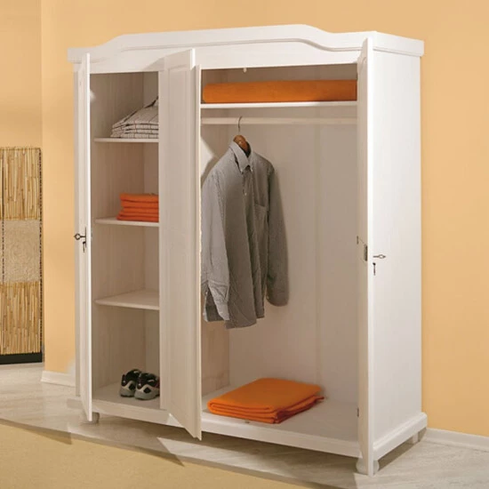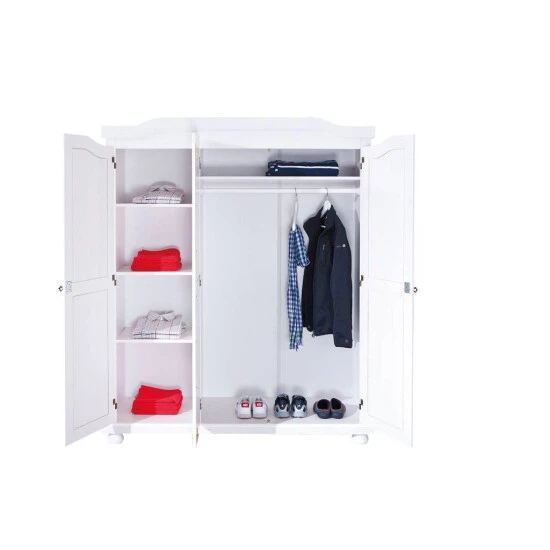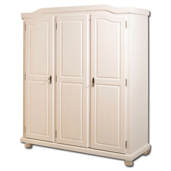Der Kleiderschrank Bastian bietet hinter 3 Türen reichlich Stauraum für Ihre Kleidung und Accesoires. Die Aufteilung innerhalb des Kleiderschranks ist praktisch und durchdacht. Auch Designtechnisch hat Bastian einiges zu bieten. Im klassischen Landhausstil bringt er eine einzigartige warme und heimische Atmosphäre in Ihr Schlafzimmer. Die Oberfläche ist weiß lackiert. Der Lack wurde so aufgetragen, dass die Maserungen des Massivholzes durchscheinen. Dadurch bleibt der natürliche Massivholzcharakter, der den Schrank ausmacht, erhalten. Der Schrank besteht aus robustem Massivholz. Das Holz stammt aus der schnell wachsenden Weihrauchkiefer, welche umweltfreundlich in einer hoch modernen Produktionsstätte verarbeitet wurde.