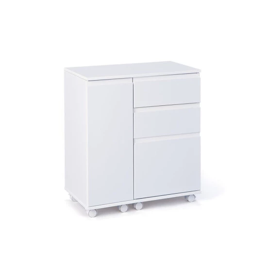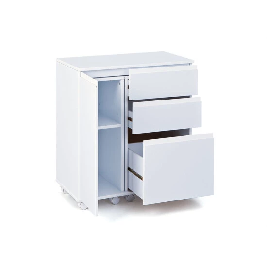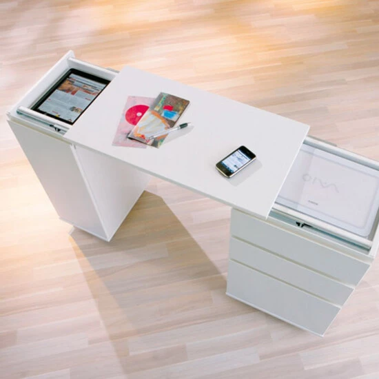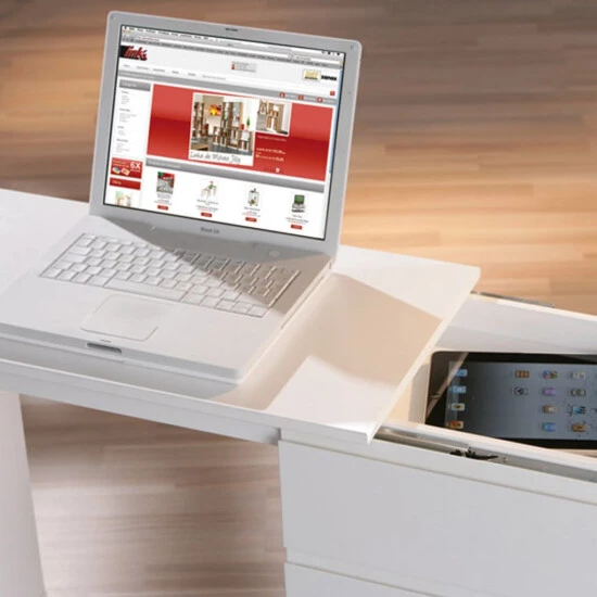 Der LAPTOP-OFFICE Schreibtisch ist für alle, die den Platz effektiv nutzen möchten. Der Schreibtisch ist vielseitig einsetzbar da er bei Bedarf schnell ausziehbar ist. Er kann im Handumdrehen auseinandergezogen werden und zu einem vollwertigen Arbeitsplatz umfunktioniert werden. Der Schreibtisch bietet so zusätzliche Ablageflächen und Beinfreiheit um mit einem Bürostuhl optimal daran Platz nehmen zu können um zu arbeiten. Auf der Ablagefläche des Schreibtisches ist Platz für einen Laptop. Zubehör wie Ladekabel etc. können in den Schubladen des rechten Containers Untergebracht werden. Hinter der Tür des linken Rollcontainers befinden sich zwei Fächer die zusätzlich, reichlich Stauraum bieten.