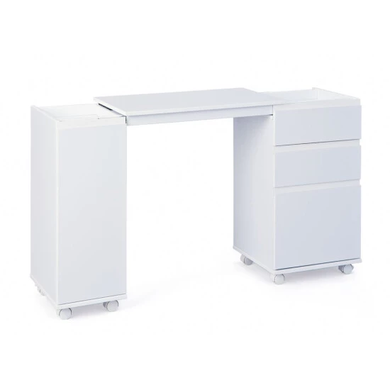 - MDF Tisch auf 8 Rollen Auszugfähig mit Metallauszügen. 1 Tür und 3 Schubladen.