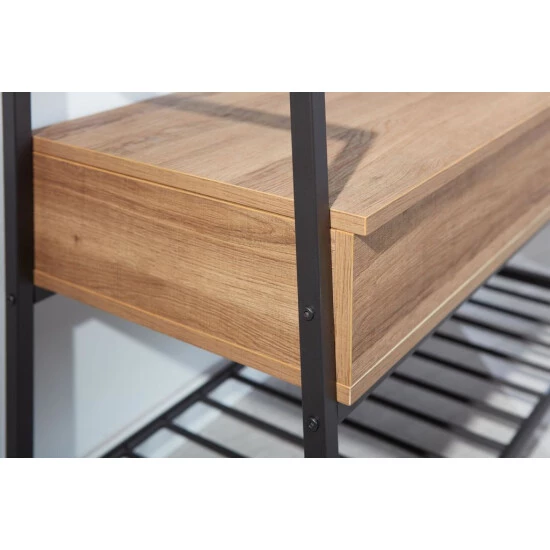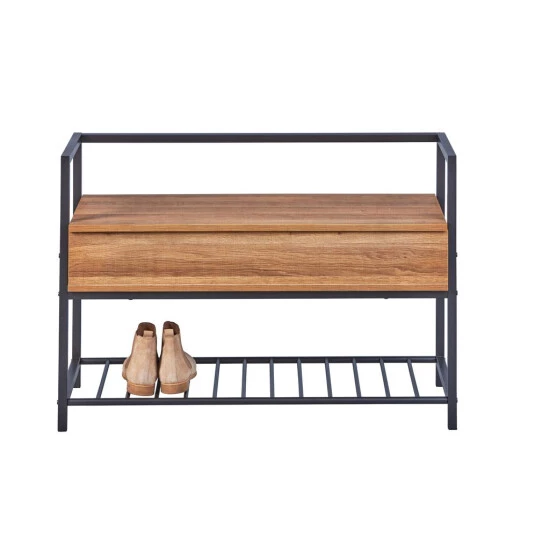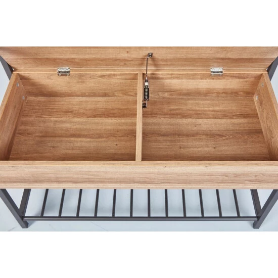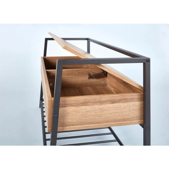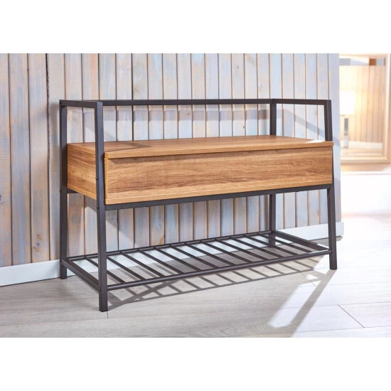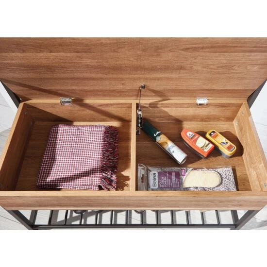Die multifunktionale Schuhbank „Shoeplace“ ermöglicht bequemes an- und ausziehen der Schuhe und sorgt gleichzeitig für Ordnung im Eingangsbereich. Die Schuhbank bietet Platz für mehrere Schuhpaare und verfügt unter der Sitzfläche über ein äußerst nützliches Ablagefach, in welchem sich diverse Utensilien wie Schuhlöffel, Schals und Regenschirme unglaublich praktisch verstauen lassen. Das Modell Shoeplace ist in punkto Funktion und Optik überaus gelungen! Die Sitzbank bietet nützliche Vorteile zum einen durch den Stauraum und zum anderen um darauf Platz nehmen zu können um seine Schuhe zu binden. Designtechnisch ist die Bank ideal für den Flur geeignet. Die Kombination aus anthrazitfarbenem Metall und Eiche-Nachbildung verleiht Ihrem Eingangsbereich einen modernen Touch im trendigen industrial Style. Die solide Verarbeitung rundet das Gesamtpaket ab.