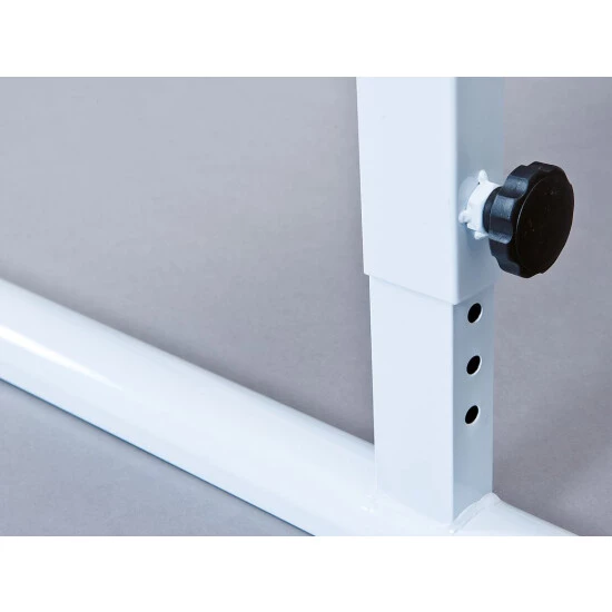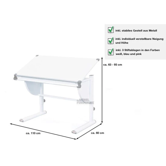 Das weiße Gestell ist höhenverstellbar, um den heranwachsenden Sprösslingen stets eine optimale Sitzposition zu ermöglichen. Zudem ist die weiße Arbeitsplatte neigbar und empfiehlt sich für Schreibarbeiten ebenso wie für Zeichenprojekte. Eine Querverbindung unterstreicht die Stabilität des Gestells. Und nun kommt der Clou. Sie können den Schreibtisch Wahleise mit einer Stiftablage in Weiß, Blau oder Pink ausstatten. Alle drei Stiftablagen werden mitgeliefert. Ausserdem befindet sich über der Ablageleiste für Stifte eine Millimeterskala an der unteren Tischkante.